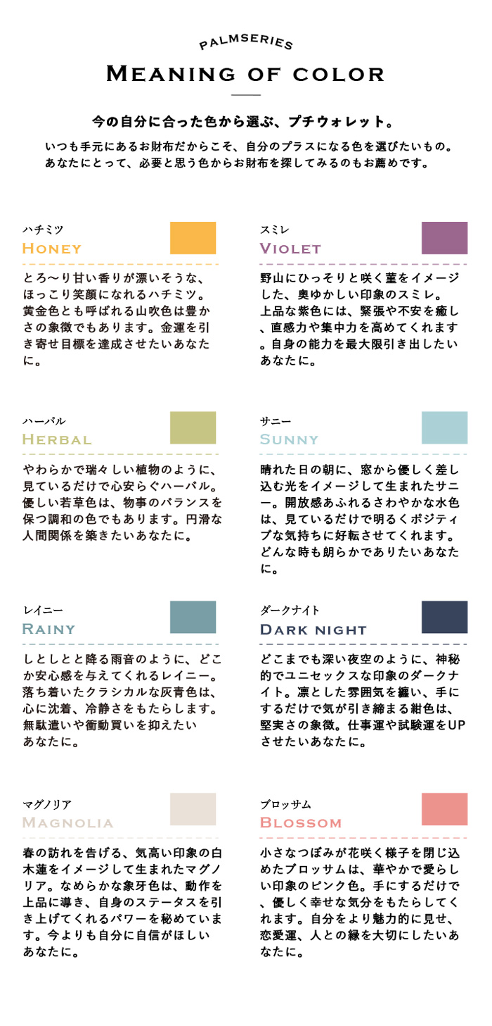 5. パルム|プチウォレット 小さい財布<ハチミツ・ブロッサム・スミレ・ハーバル・サニー・レイニー・ダークナイト・マグノリア>
