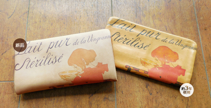 左:新品のラウンドシリーズの長財布 / 右:約3年間使用後 (デザイン:スタンラン ミルク)