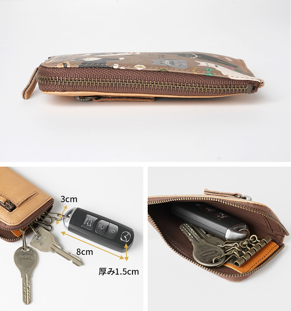家の鍵や職場の鍵など、日常で使う鍵をまとめて収納できます。インテリジェントキーを入れて使う場合はボリュームに合わせて本数を調整してください。