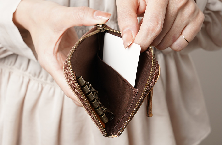 内側にカードポケットが付いているので、ICカードなどをまとめて持ち歩けます。