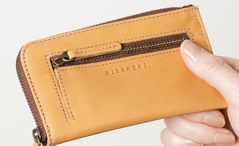 表面には、HIRAMEKI.が自社でお作りする、革本来の質感そのままに革へデザインを施した「アートレザー」を使用しています。ラウンドシリーズは、革や縫製で、手に持った時のやわらかさや、ずっと触れていたくなる質感にこだわってお作りしています。