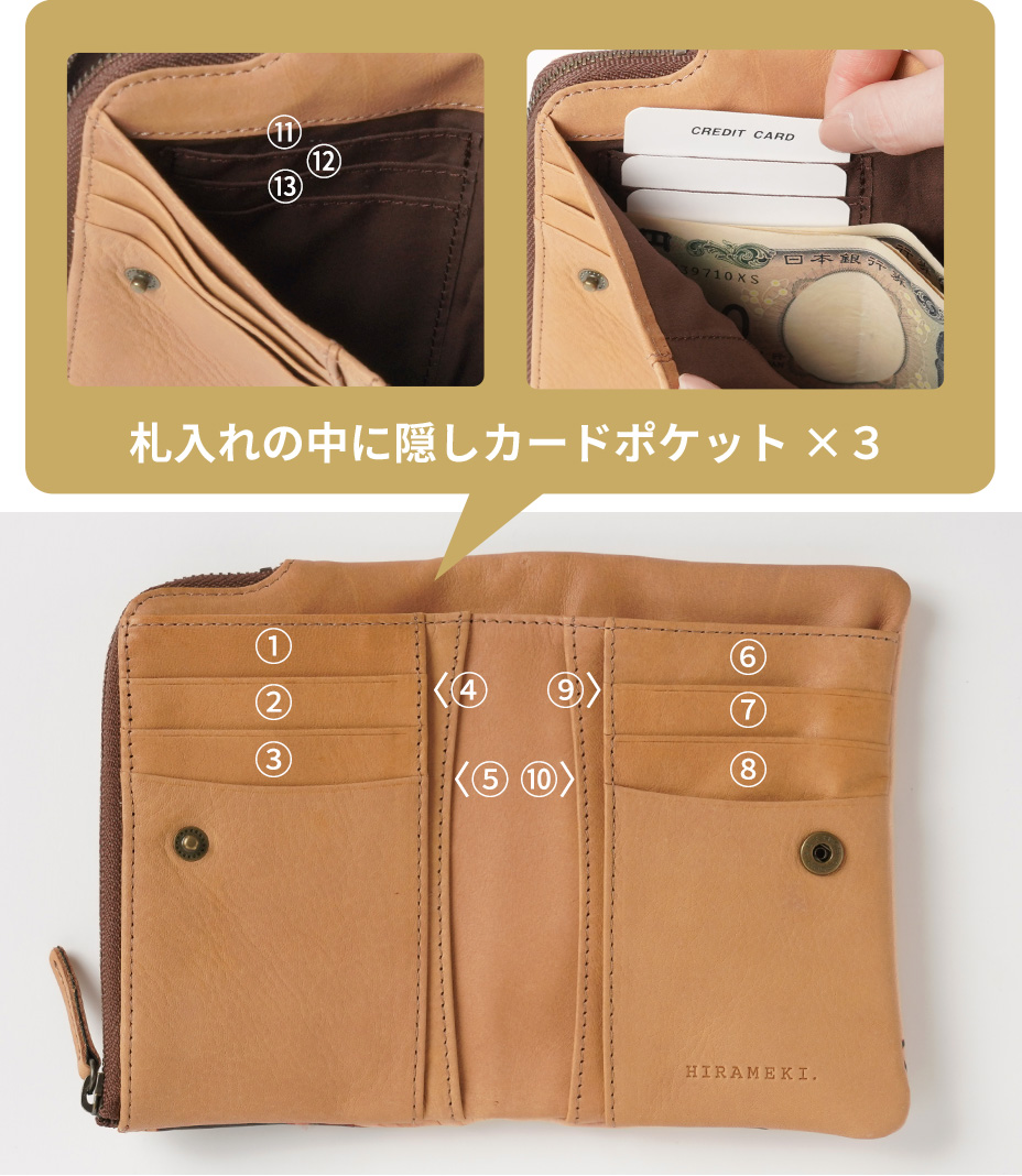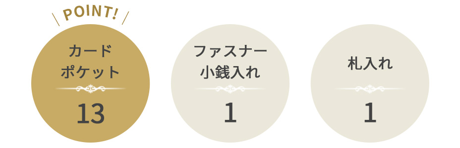 ・機能 / カードポケット×13、ファスナー小銭入れ×1、札入れ×1