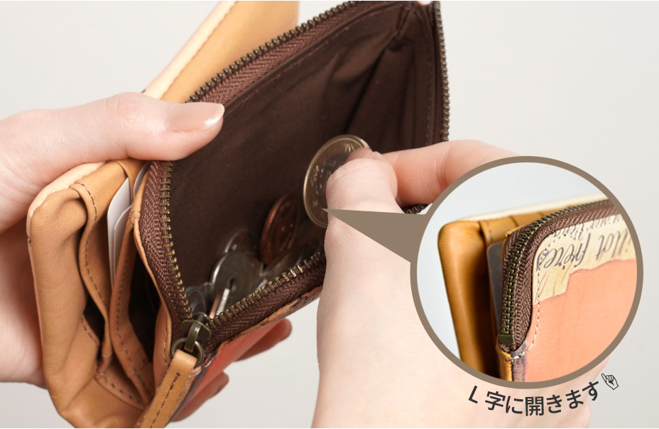 外側に付いた小銭入れは、ゆったりとした作りで容量もたっぷり。L字に大きく口が開くので、中の小銭が見やすく、お会計もスムーズです。