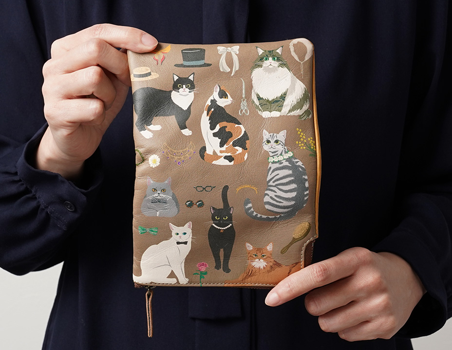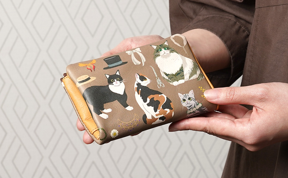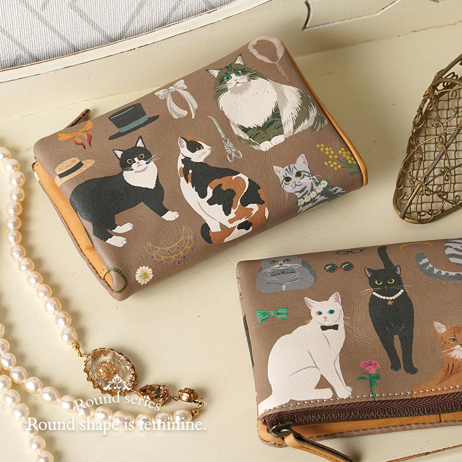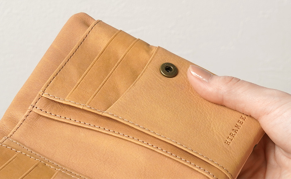 表面には、HIRAMEKI.が自社でお作りする、革本来の質感そのままに革へデザインを施した「アートレザー」を使用しています。ラウンドシリーズは、革や縫製で、手に持った時のやわらかさや、ずっと触れていたくなる質感にこだわってお作りしています。