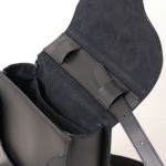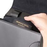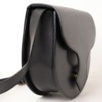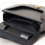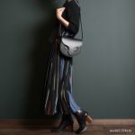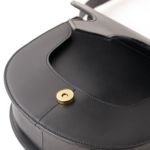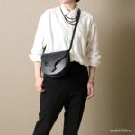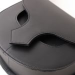 バッグの形状をかっちり保てるよう、ハードな牛革を使用。ベルト通しをフラップの内側に配し、バッグ表面の装飾を極力なくすことで、エッジの効いデザインが引き立ち、アーティスティックな印象に仕上がっています。